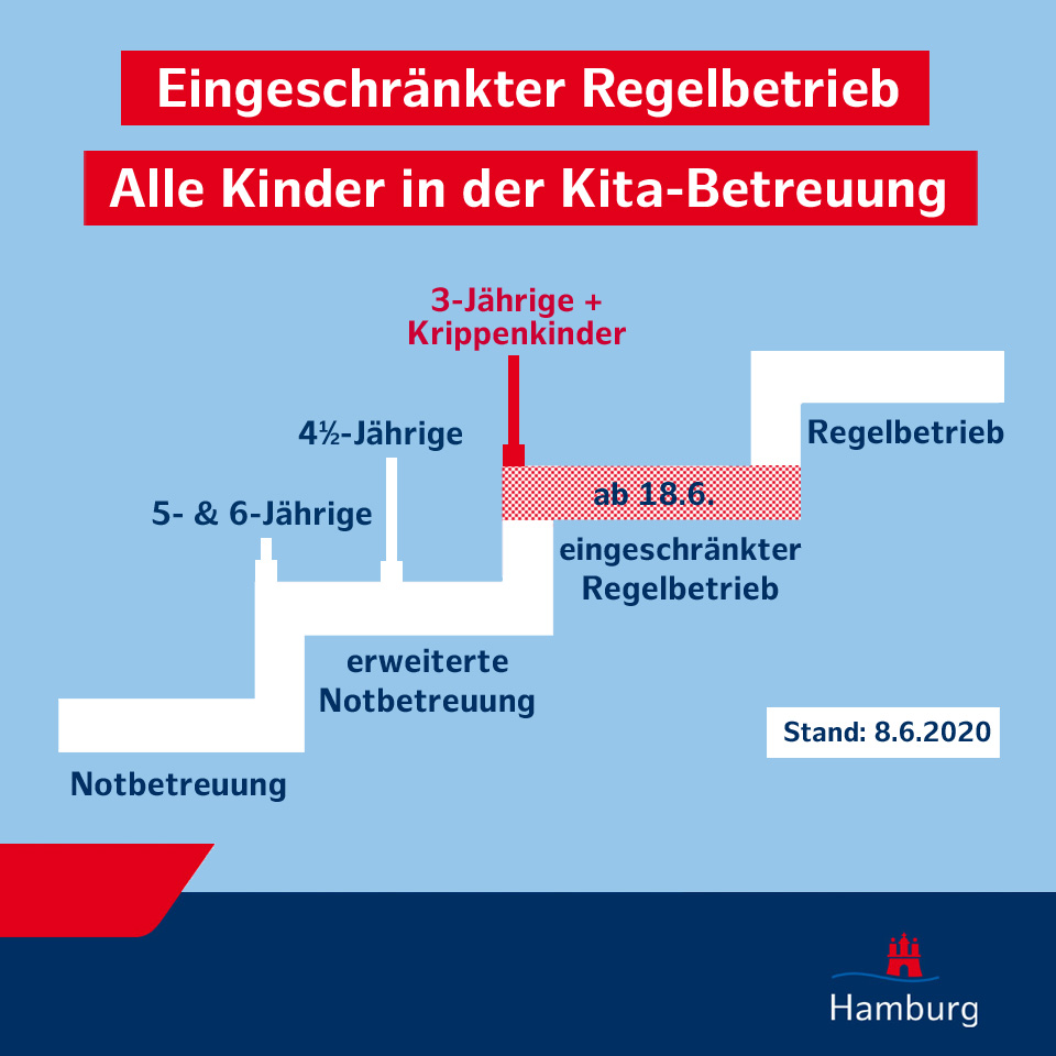 Auf der gemeinsamen Pressekonferenz der BASFI und der AGFW - Senatorin Leonhard und Herr Stappenbeck - wurde heute mitgeteilt: Hamburg beschreitet den nächsten Schritt Richtung Kita-Alltag: Ab 18. Juni  eingeschränkter Regelbetrieb für alle Kinder unabhängig vom Alter